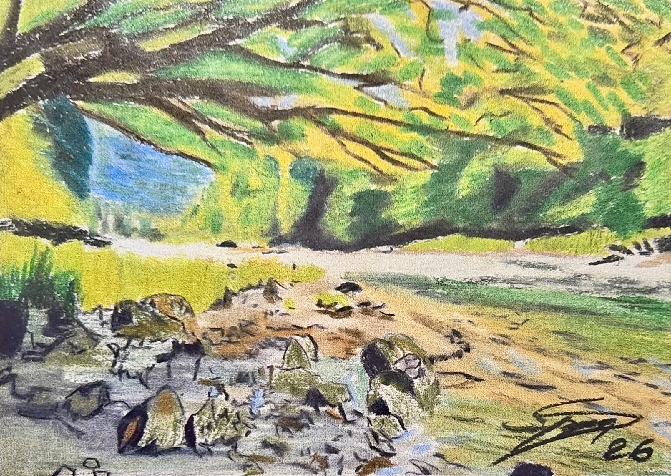 Avec "Promenade au bord du Doubs", David Tardy propose une immersion sensible dans les paysages familiers du Clos du Doubs. À travers aquarelles et dessins aux couleurs vibrantes, il capte des instants fugaces : reflets de l’eau, lumières filtrées sous les feuillages, berges silencieuses.